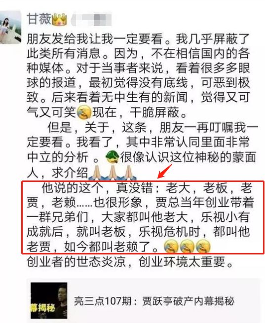 甘薇近日还发了朋友圈谈贾跃亭破产一事,用“老大”“老板”到“老贾”“老赖”来形容,也算是感叹这一路走来不容易。