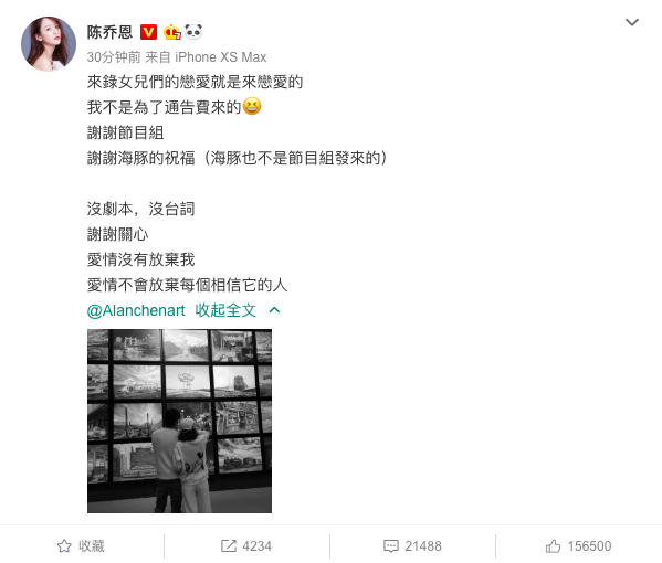 不仅不信,还坚持节目中的甜就只是剧本设定,热搜之后也是质疑声居多。不过今天过后,不信的人改变立场了,因为陈乔恩正式官宣了。