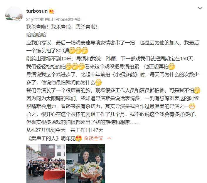 原标题:孙俪《卖房子的人》杀青晒剧组合照,自曝最后镜头拍了80