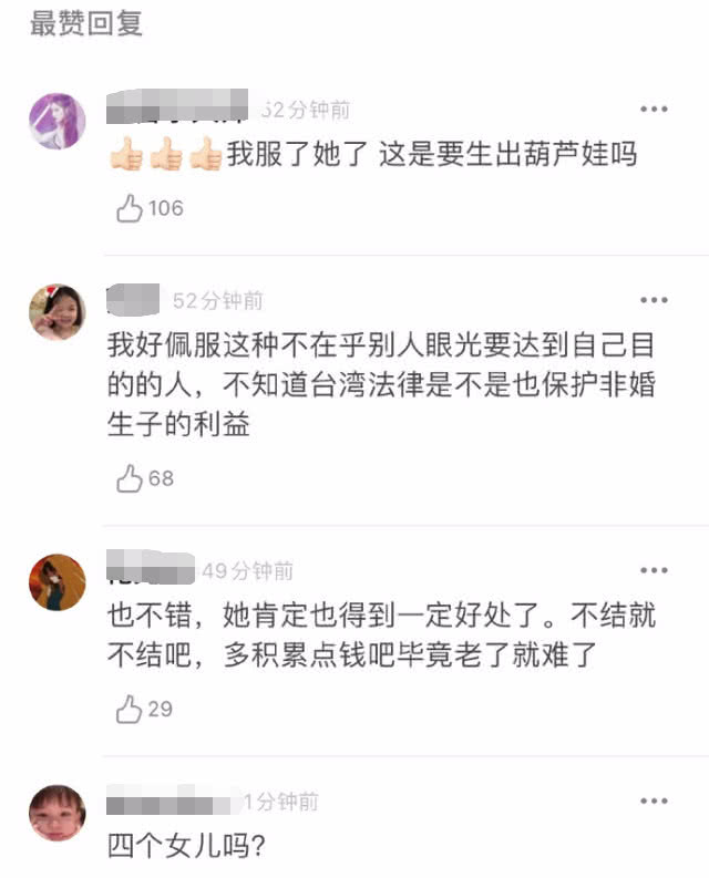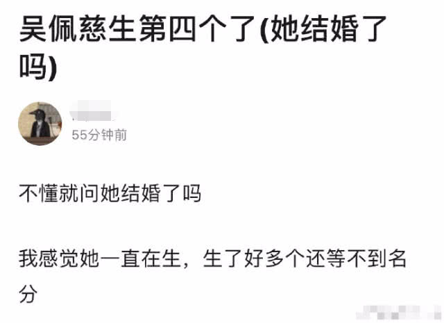 因此,惊闻吴佩慈生下第四胎后,很多网友表示质疑:“她结婚了吗?我感觉她一直在生,生了好多个还等不到个名分!”为此有网友就评论道:“好佩服她这种不在乎外人眼光要达到自己目的的人!”“也不错,她肯定也得到一定好处了。不结就不结吧,多积累点钱,不然老了就难了。”网友的评论倒是挺中肯,但对吴佩慈而言,生育或许是一种幸福的事,所以才会乐在其中,而别人自然无法理解个中曲直。