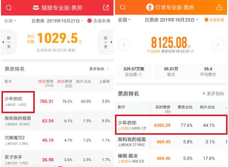 果然,《少年的你》宣布定档后,预售票房非常火爆,截至10月25日凌晨1点多,短短3天时间,预售票房突破1亿元,创下国产青春片预售票房纪录。上映首日排片高达44.1%,完全是超级大片的待遇。据灯塔专业版票房数据,截至25日8点52分,该片实时票房6305万元高居榜首,远超同日上映的新片《催眠·裁决》《天作谜案》。