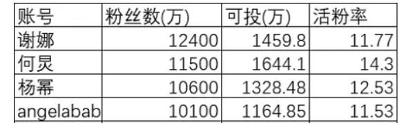 结果发现,谢娜1.24亿的粉丝,可投粉丝数为1459万,活粉率为11.77%;何炅1.15亿粉丝,可投粉丝数为1644万,活粉率为14.3%;杨幂1.06亿粉丝,可投粉丝数为1328万,活粉率为12.53%;杨颖1.01亿的粉丝,可投粉丝数为1165万,活粉率为11.53%。