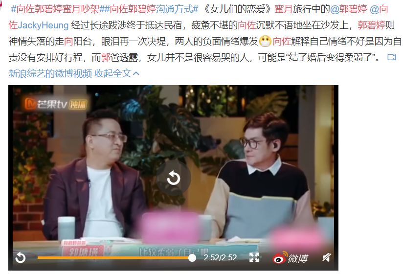 向佐和郭碧婷夫妇结完婚后没想到蜜月旅行继续放在了综艺上,这真是从认识到相恋到结婚,整个过程都有综艺记录,木得隐私啊。这回他们的蜜月旅行开头就气氛压抑,因为向佐开快车让她不舒服,加上郭碧婷导航失误,大家也是舟车劳累,导致情绪都不好,所以很容易因为小矛盾而冷战,甚至郭碧婷还因此落泪。