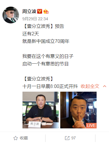 原标题:周立波10·1晒出55秒视频称:开抖了,预示网络