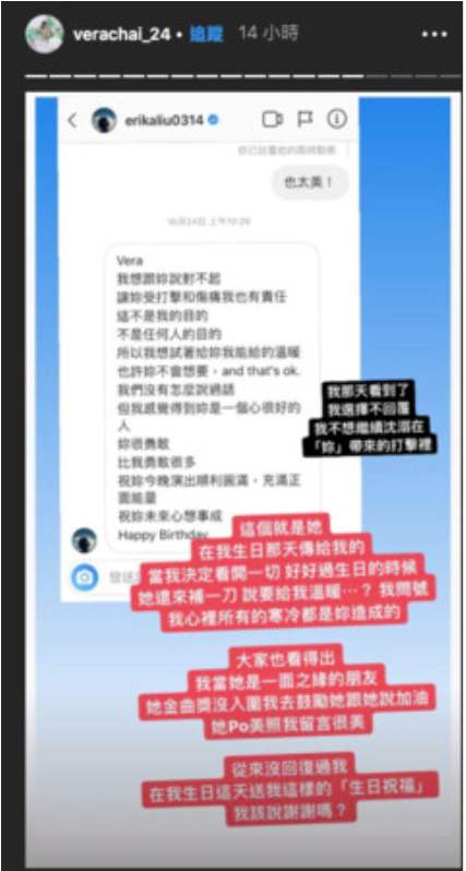 之后Vera Chai选择和吕孝廷和平分手,大度退让,没有和任何人撕破脸。Vera Chai这样的做法让吕孝廷心怀愧疚,刘艾立在Vera Chai生日当天,也就是10月24日,向Vera Chai发了私信,说明了自己的歉意,并表示:“你很勇敢,比我勇敢很多。”可刘艾立一边说着让Vera Chai勇敢起来的话,一边又在社交动态上暗讽他,并用侮辱性的词语形容Vera Chai。