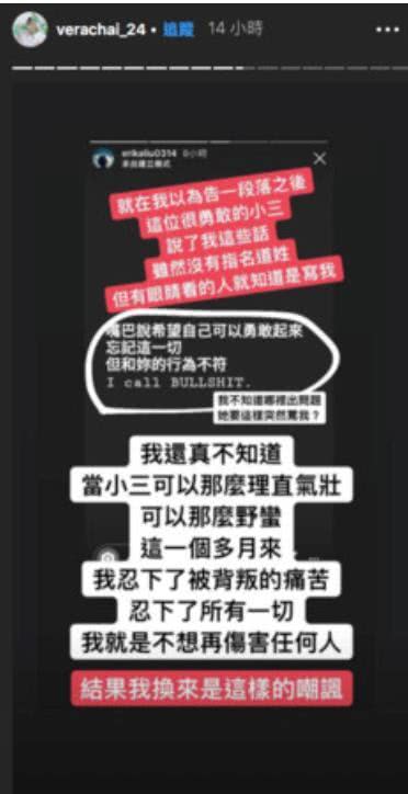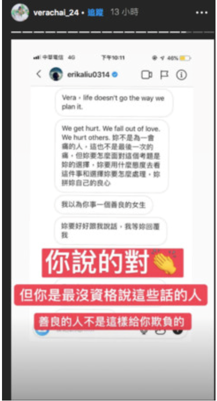 Vera Chai晒出刘艾立与她的聊天记录,刘艾立口口声声说着Vera Chai很善良,很勇敢并向她表达了自己的歉意。但刘艾立却丝毫不顾及Vera Chai的感受在社交平台公然与吕孝廷秀恩爱,俨然一副胜利者的姿态,还时常发文暗讽Vera Chai。刘艾立的种种行径,让Vera Chai忍无可忍,表示:“我还真不知道当小三可以那么理直气壮,可以那么野蛮,这一个多月以来我忍下了被背叛的痛苦,忍下了一切,换来的是这样的嘲讽。”
