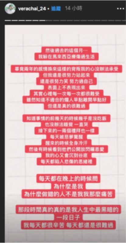 Vera Chai声称自己在知道吕孝廷劈腿之后,很难过,两年的感情换来的却是背叛。在刚开始知道的时候自己几乎没办法吃饭,还时常做噩梦,言语之间能够看得出Vera Chai在分手之后的痛苦挣扎。