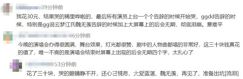 有网友说:今晚是大型催泪现场,特别演唱会尾声,设计了每一位主演依次上台,以剧中人的身份向观众行礼拜别“告辞”的环节,惹得观众泪雨纷纷。