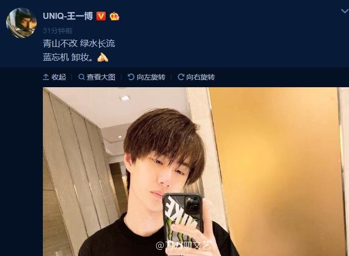 今晚,演唱会结束后,王一博晒出素颜照,发文告别:“青山不改,绿水长流,蓝忘机,卸妆。”