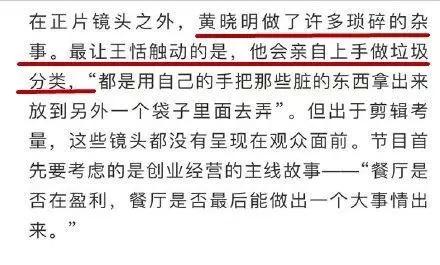 《中餐厅》节目组感谢黄晓明完成KPI的热搜还记忆犹新,节目组工作人员还提到黄晓明会亲自进行垃圾分类等细节,开始让不少观众对他改观。
