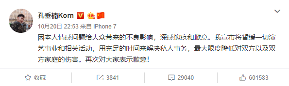 就这样,虽然被爆的只是个nbcs的糊咖,但效率却非常给力,昨晚接近11点钟的时候孔垂楠给出了回应,暂缓一切演艺事业和相关活动。