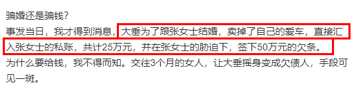 先曝光孔垂楠卖车全额转账给了张孟妍,指责女方骗钱骗婚。
