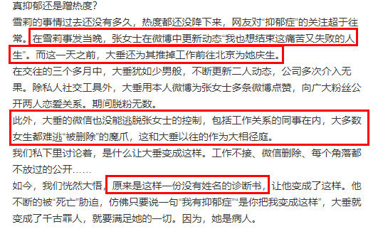 不仅如此,该博主还指出张孟妍的抑郁症是拿一份没有姓名的抑郁症诊断书伪装用来威胁孔垂楠的。