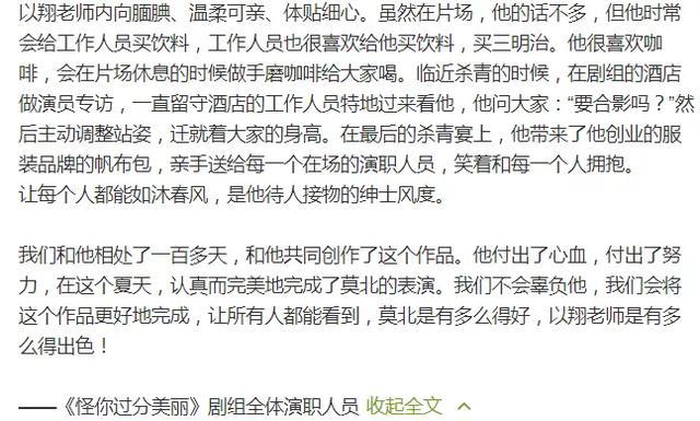 高以翔出事之后,《怪你过分美丽》官微便发了一条长微博来悼念。追忆了高以翔在拍摄期间的点滴细节,赞他守时、认真、温柔。并且表示说会将作品更好地完成,让所有人都能看到,高以翔老师是多么得出色!