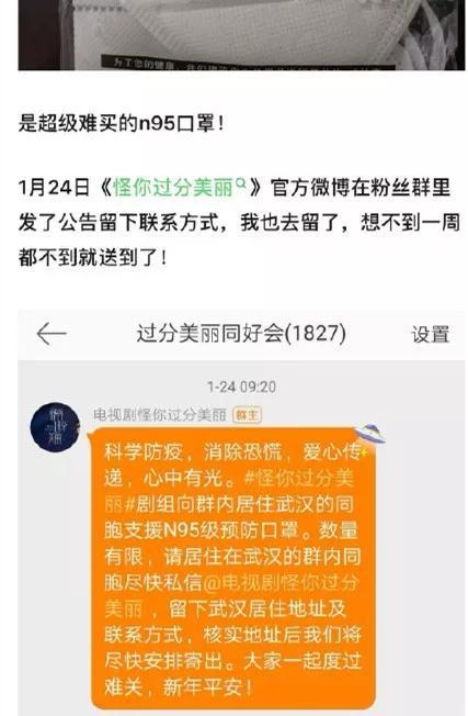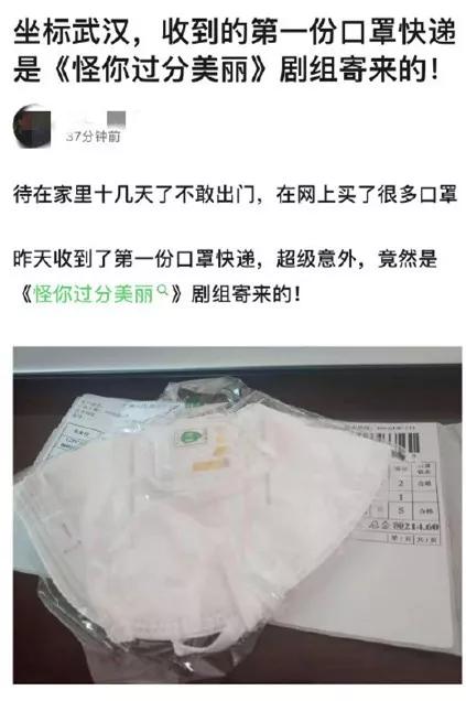 这位网友自称坐标武汉,待在家里十几天不敢出门,在网上买了很多口罩,但是收到的第一份口罩快递,竟然是《怪你过分美丽》剧组寄来的,超级意外。
