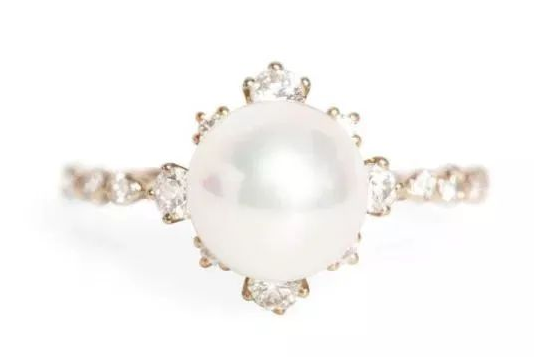 这次的订婚戒指也很有心,并不是一颗钻石,而是古典路线的珍珠,周边一圈小钻石,精致又独特。