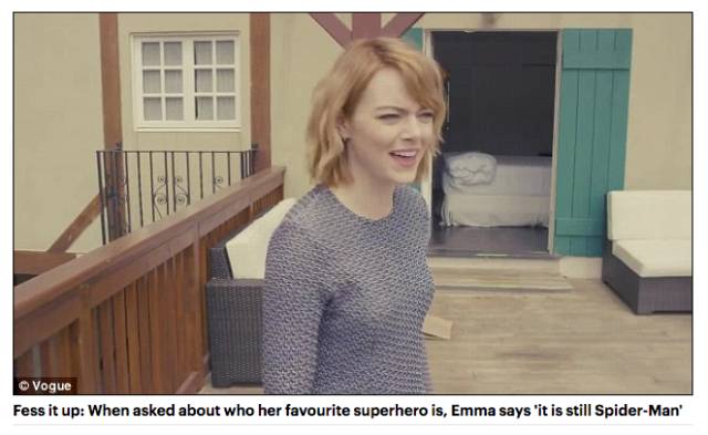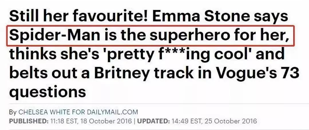石头姐在采访中被问及最爱的超级英雄,不假思索的回答“蜘蛛侠”。