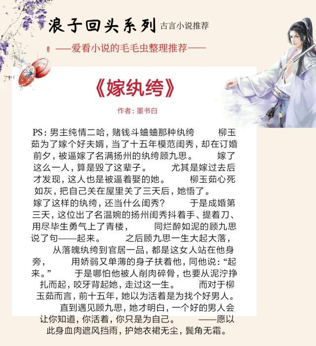大家好,我是毛毛虫,十年书龄小仙女,每天为大家推荐各种好看的言情小说。希望大家能够喜欢,喜欢的话可以分享给朋友,或者收藏起来。若大家有什么想看的书,可以在下方留言哦。本期整理的是4本浪子回头的古言,《嫁纨绔》惊艳来袭,宠坏纨绔变深情忠犬