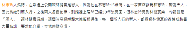 林志玲虽然和两人虽然有近30年没有见面,但是在林健寰到达婚礼现场的时候,林志玲立马就认出了林健寰,并大喊了一声“恩人”。这两个字让林健寰不禁红了眼眶,在林健寰的心目中林志玲一直还是当初他带入行时的样子,没想到一晃30年过去了,再次见面竟是在林志玲婚礼上,让林健寰感慨颇深。