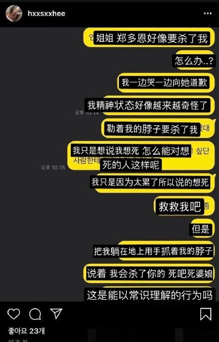 韩瑞熙坦言自己的精神状态不佳,还称自己感觉太累所以有点不想活下去了。从对话截图来看,韩瑞熙正在承受着身体和心理的双重打击,所以向自己信任的人发出求救讯号。韩瑞熙不停的像自己口中的姐姐哭诉自己所遭遇的不幸,称郑多恩不仅将自己压在地板上掐脖子嘴里还喊着:“我会杀了你的,死吧。”但随后郑多恩却又哭着说:“我这是在阻止你死。”