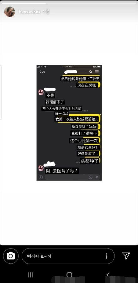 韩瑞熙表示自己第一次被打得这么惨,表示:“她真的是女的吗?好像是疯了,我头都肿起来了。”对话中的姐姐也在一直担心着韩瑞熙的情况,建议韩瑞熙暂时和郑多恩先分开一段时间。韩瑞熙在上传对话截图几分钟之后就将其删除了,但有不少粉丝还是看到了,立即寻求相关部门的帮助,很是担心韩瑞熙的安危。