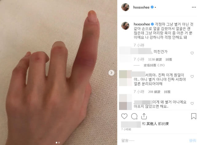 韩瑞熙在12月13日凌晨的时候更新社交动态,表示:“别担心,没什么大事,有用手保护脸所以脸没事,只是头和脖子有点痛而已,我很坚强的,不用担心我。”韩瑞熙晒出自己的手,能够很明显的看见食指瘀青肿起,甚至有点歪斜,手臂上也都有多处瘀青,让人十分担心。