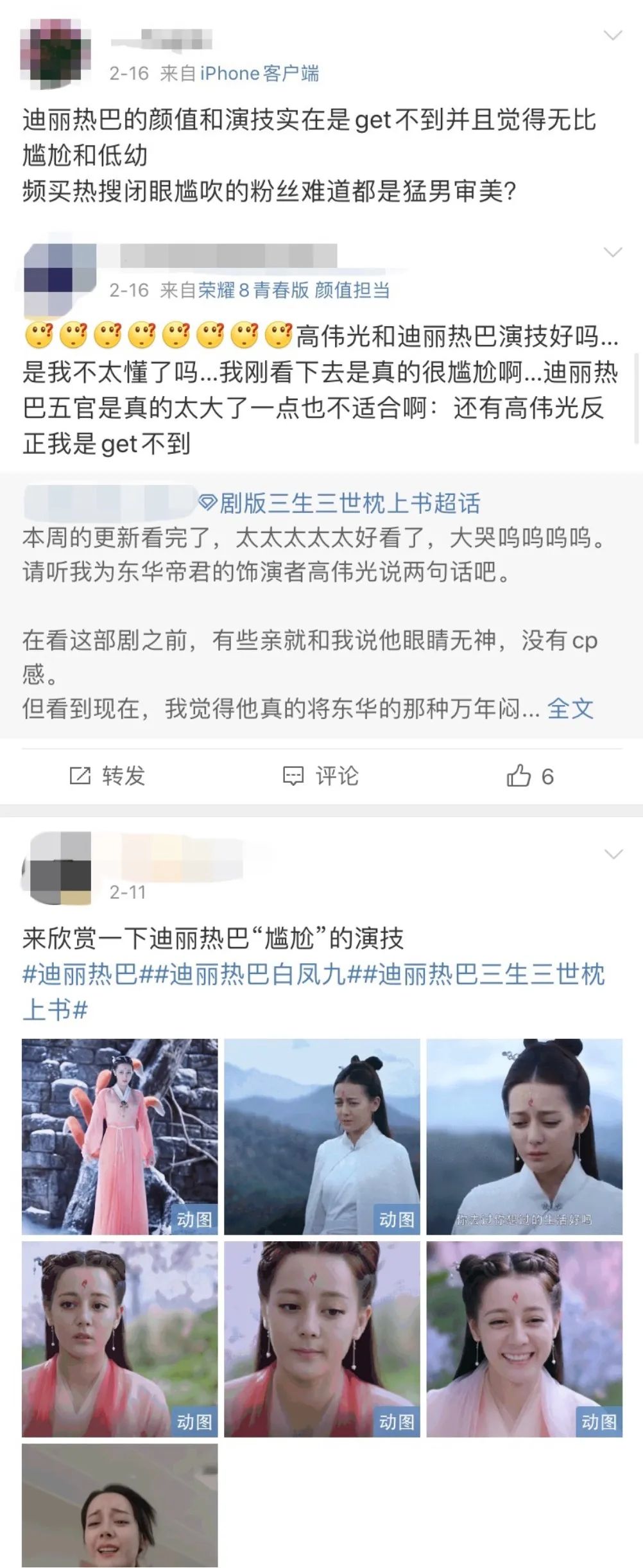 “迪丽热巴 演技”、“凤九 窝窝头”这种话题背后,很多人开始po出追剧截图质疑热巴颜值下降,演技尴尬,持此态度的人还不算少,除去粉丝精修图,演技尴尬的tag可以说是群嘲一样的存在。