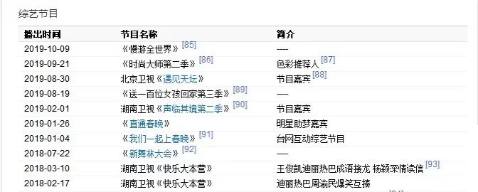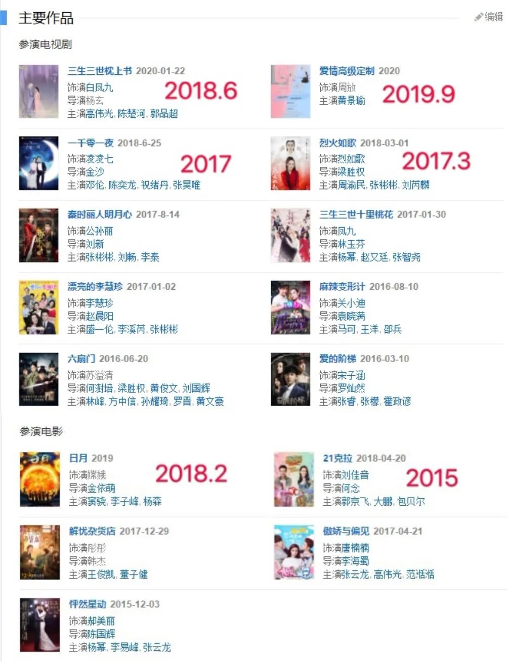 2018年到2019年迪丽热巴参与了极限挑战、创造营、声临其境等综艺节目,代言和时尚资源也节节攀升,但她参与的影视剧拍摄却屈指可数,待播的电影和电视剧也是之前的存货,2019年仅有《爱情高级定制》一部作品(红字标注为拍摄时间)。