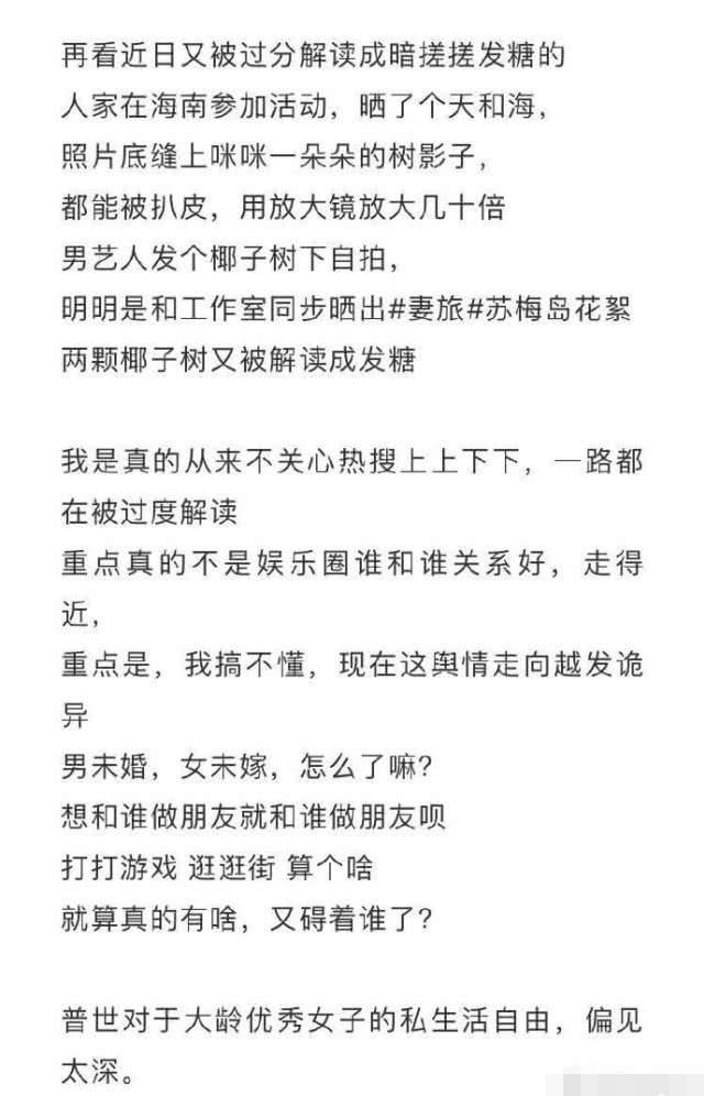 对于外界关于二人暗戳戳发糖的解读,她更是表示道:“男未婚、女未嫁,怎么了嘛?”“就算真的有啥,又碍着谁了?”