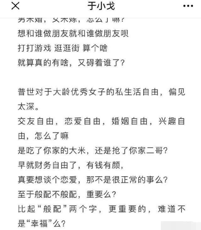在16日,身为杨幂好友的知名主编于小戈公开发文对外分享了自己的爱情观,从其字里行间也不难看出,此次长文似乎也是其对外界关于杨幂魏大勋恋情争议的回应。