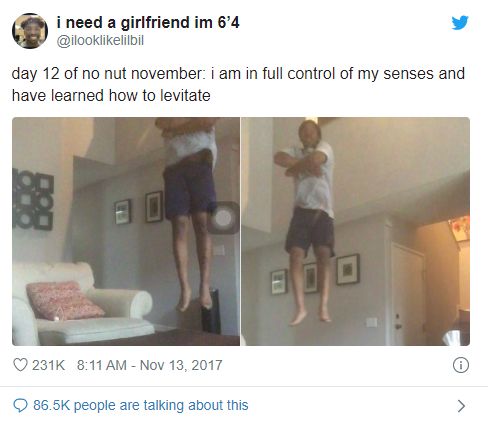 这是一项庄严神圣的运动,它始于神秘的西方,对参与者的意志和耐力都有着极高的要求。每年的11月,无数雄性宅宅们开始自发地在社交网络上聚集,他们斗志昂扬,他们互相鼓励,只为了能完成这一年中难度最大的挑战——“No Nut November”。
