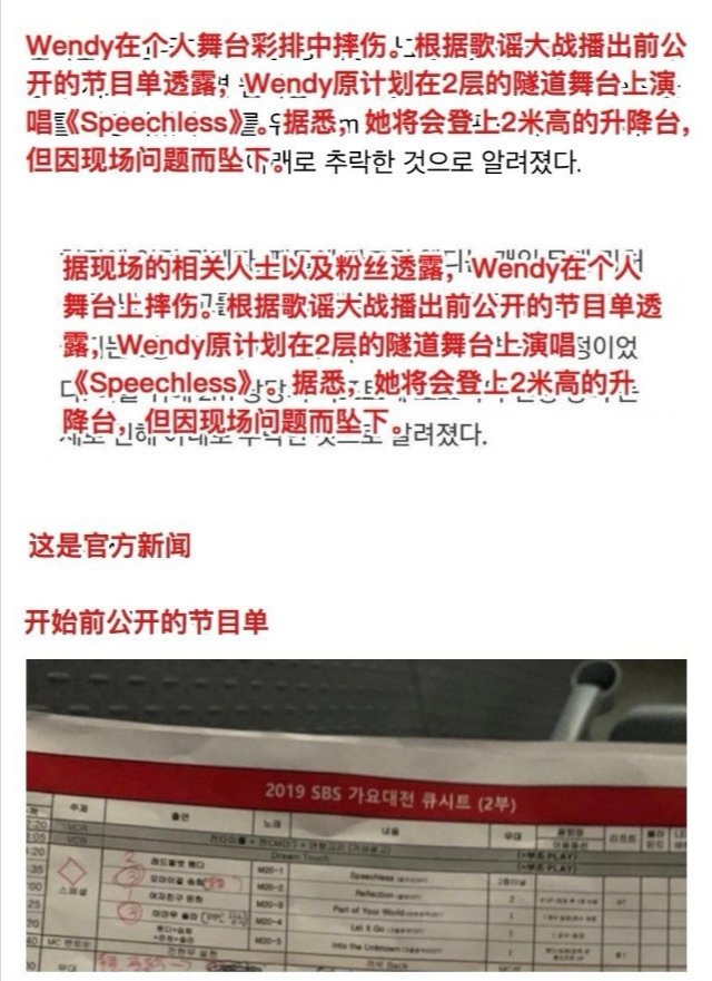 根据歌谣大战播出前公开的节目单透露,Wendy原计划在两层的隧道舞台上演唱《speechless》,但因现场问题而不慎坠下。