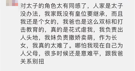 可是皇上和太子的这种相处方式还是存在于现实当中的,网上看到有一个网友说对于太子的角色太有同感,不过太子家里还有皇位要继承呢,自己是个女生,爸爸却也是双标严重,作为家中老大,父亲对她的严格程度完全强于她妹妹。