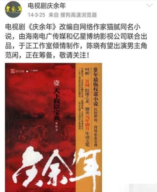 据悉,2014年3月25日,《庆余年》制作方注册官方微博并发文称“电视剧《庆余年》改编自网络作家猫腻同名小说,由海南电广传媒和亿星博纳影视公司联合出品,于正工作室倾情制作,陈晓有望出演男主角范闲,正在筹备,敬请关注!”。