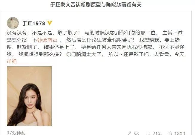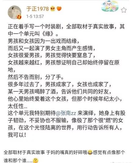 昨天下午,于正就胡来了一次,他发了一条微博,吧啦吧啦说了一大堆,大概意思就是一个已婚的男明星与已婚的女明星的意难忘爱情经历。