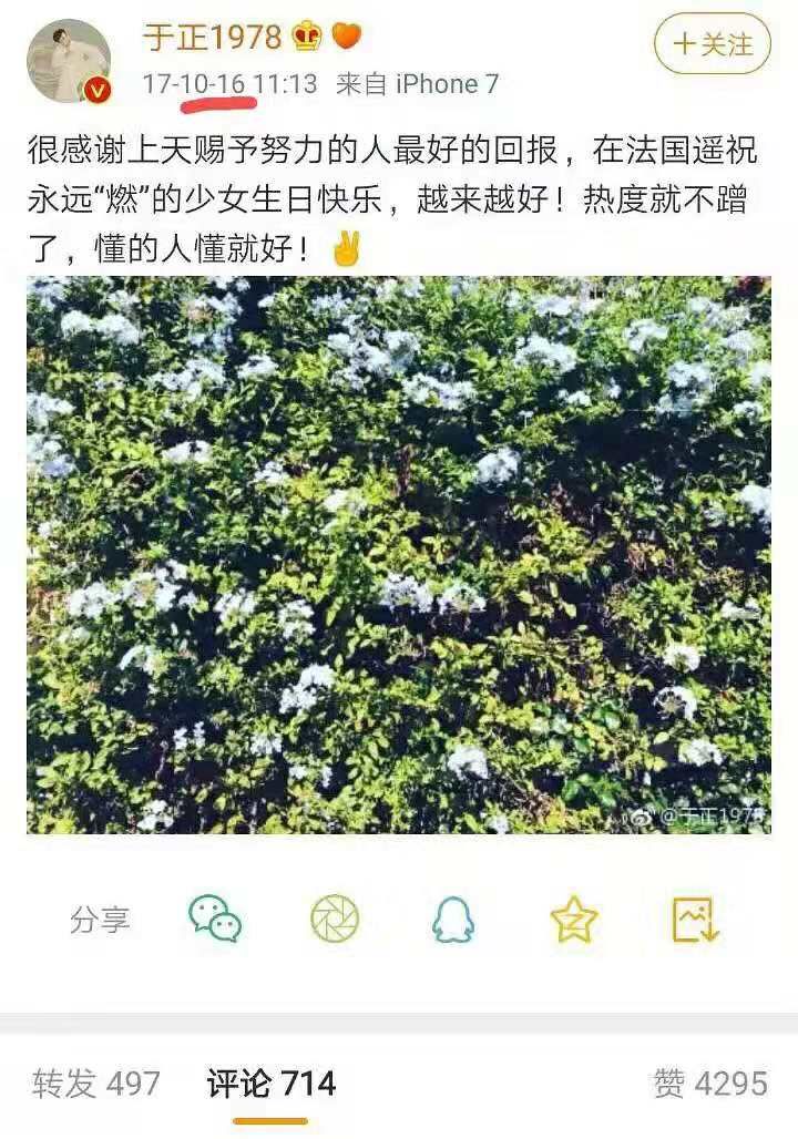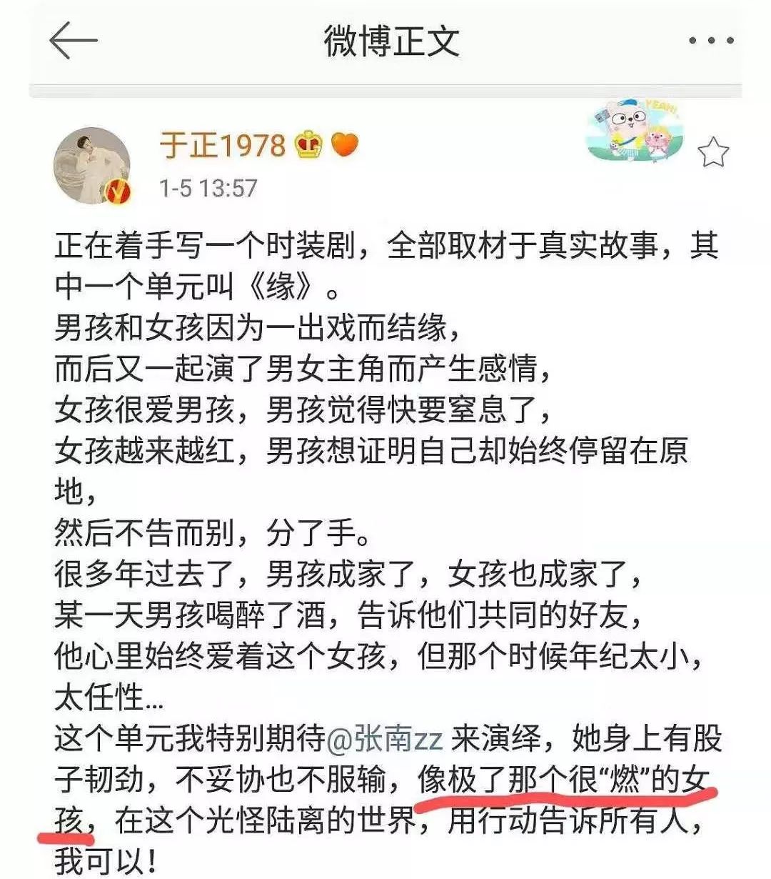 “很燃的女孩”?2年前的10月16日,于正曾经发过一篇微博,说祝那个很“燃”的女孩生日快乐,为了不蹭热度,就不艾特了。