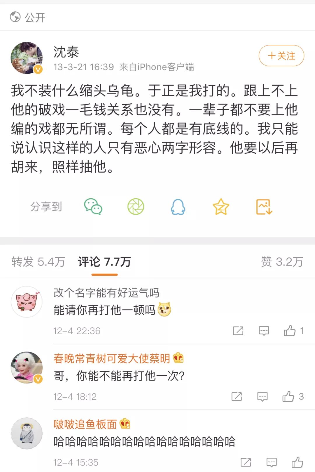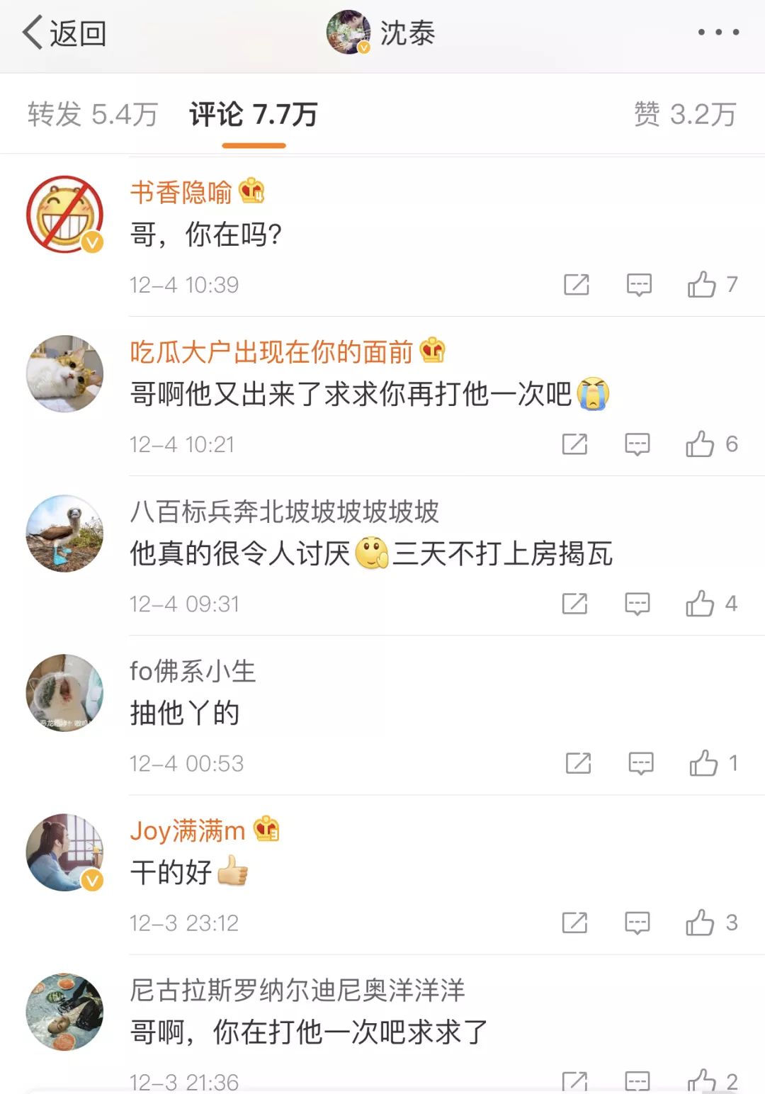 哪怕是到了今天,不爽于妈的人,还是会纷纷跑到沈泰微博底下,要求“再打一次”的!