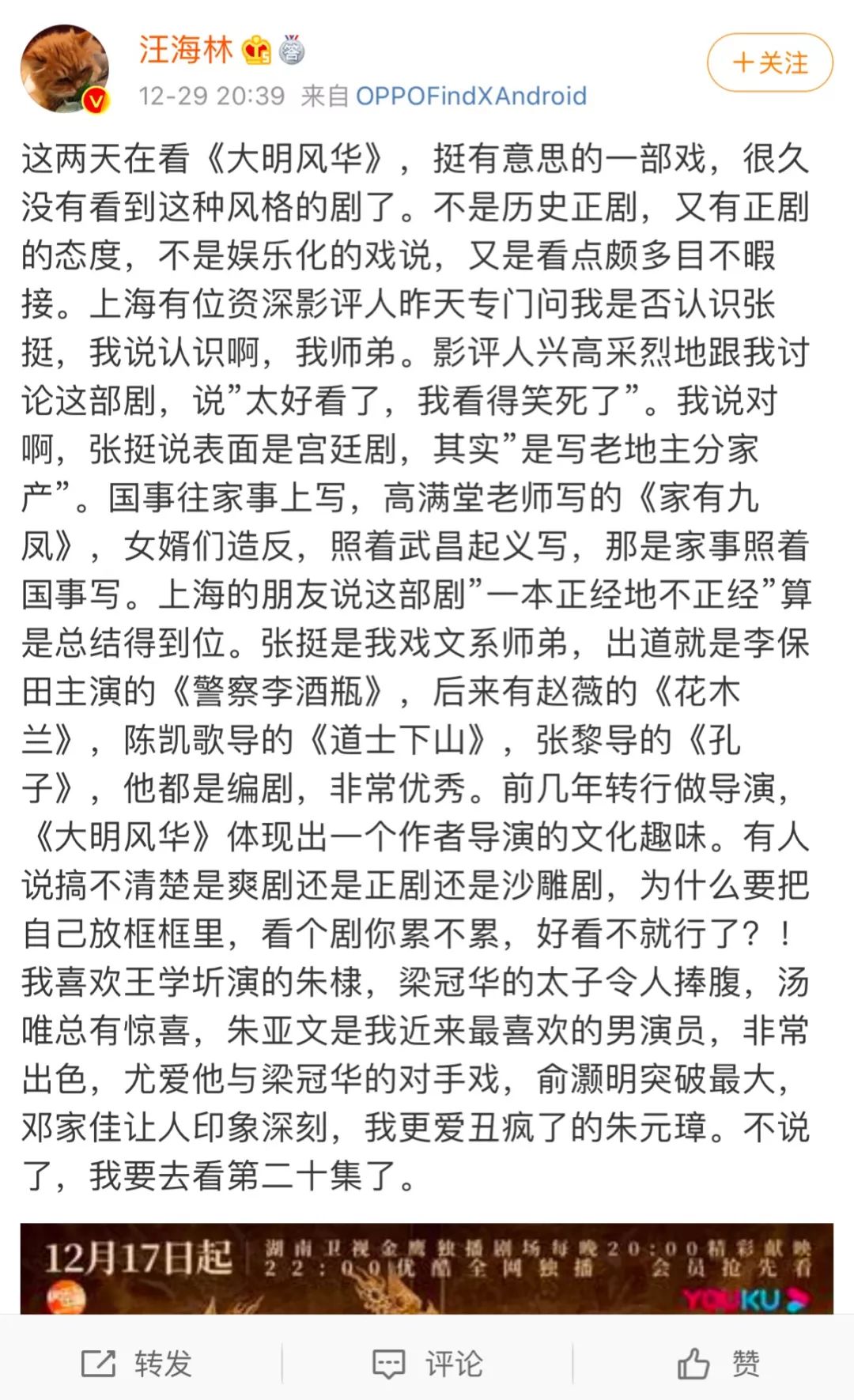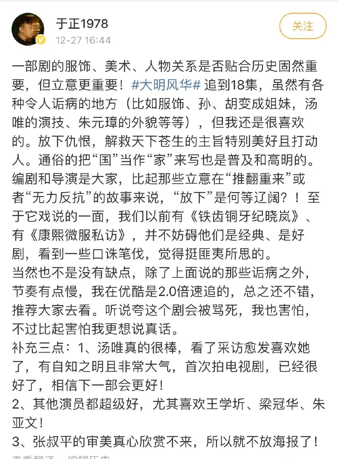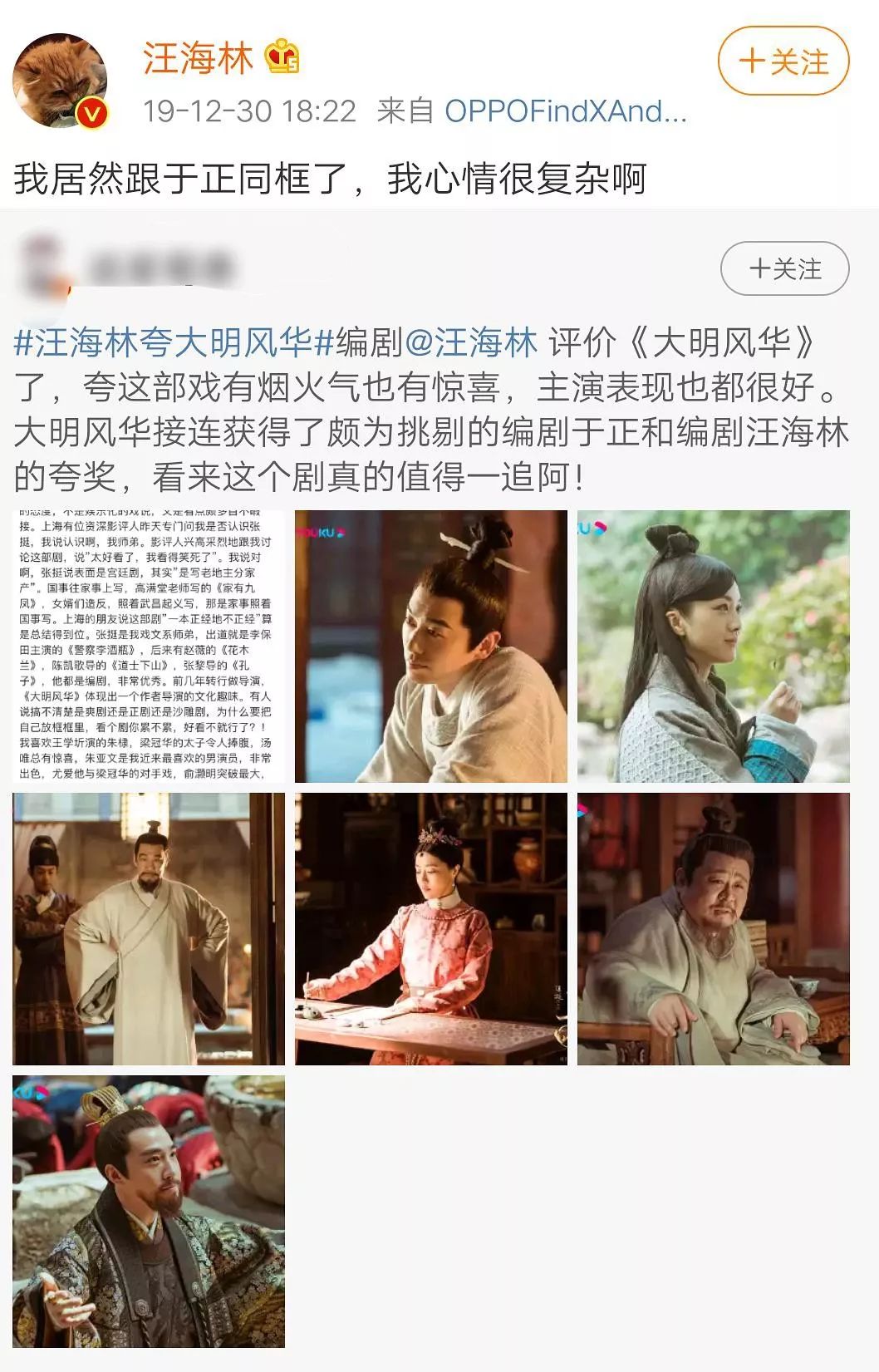 结果,人大V本来好心三方都夸了,结果我们汪大编剧站出来,说,我居然跟于正同款了???太丢人!