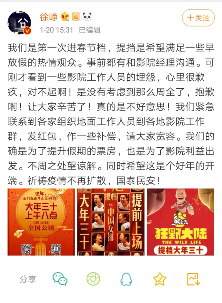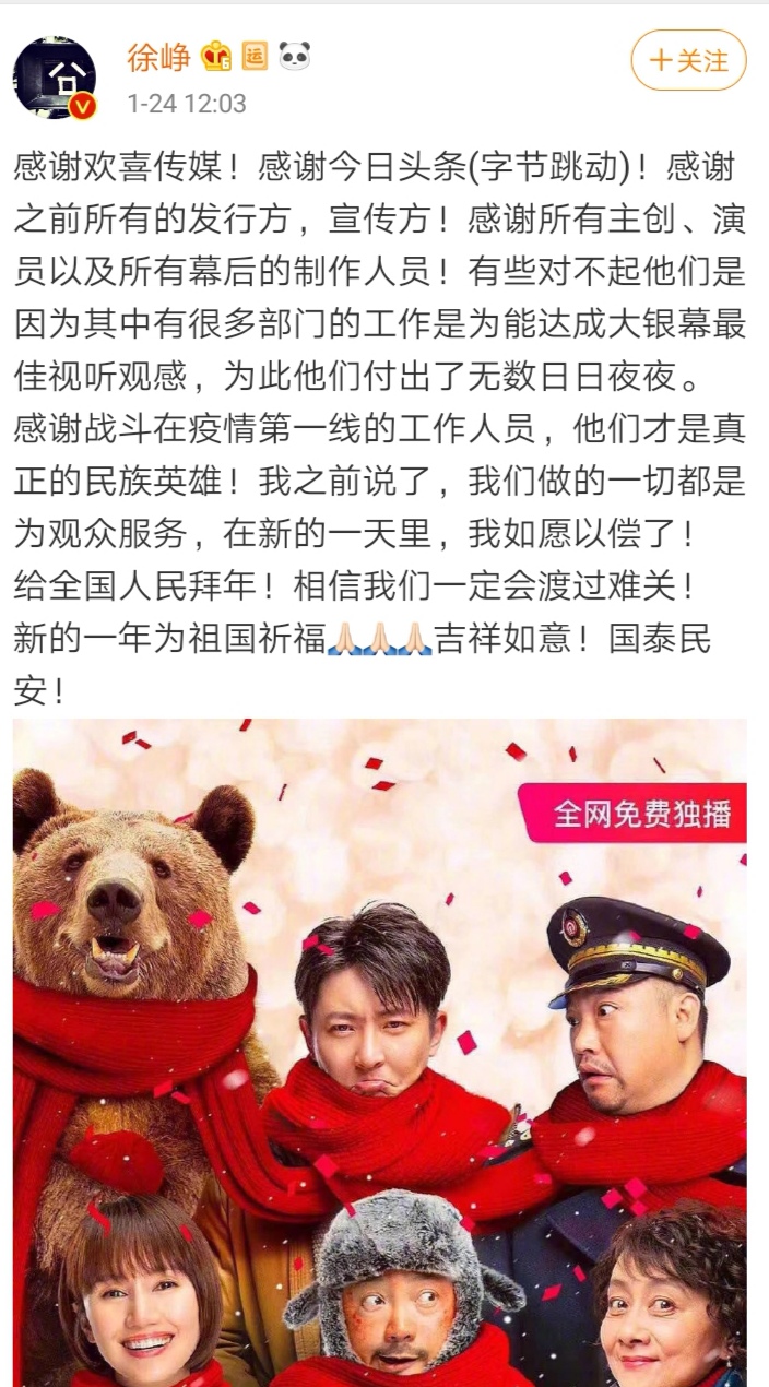 而对于这件事徐峥导演之后也发了微博表示感到抱歉,因为第一次进春节档,提档是为了满足一些热情的观众,而没有考虑到工作人员,表示将会发红包补偿大家,但现在的事实也的确证明,徐峥导演并不是为了票房也不是对赌,不然也不会现在宣布《囧妈》大年初一全网免费播出,对于这件事也让一些网友感到此前误会了徐峥导演,还表示希望徐峥导演合理收费不然不好意思。
