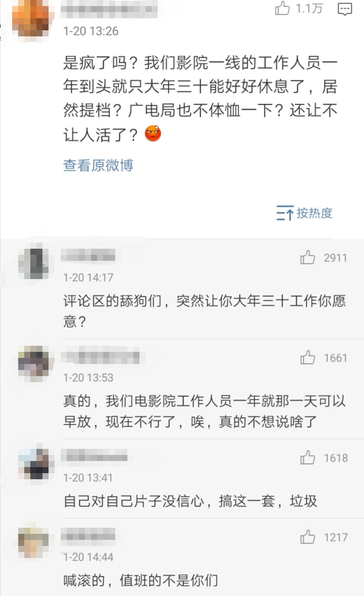 在此前,徐峥导演曾发微博《囧妈》提档!改到大年三十,上午八点电影全国公映!因为这件事曾被网友说对赌《囧妈》为了新戏拼了,还有影院工作人员不满到“是疯了吗?我们影院一线的工作人员一年到头就只大年三十能好好休息了,居然提档?广电局也不体恤一下?还让不让人活了?”