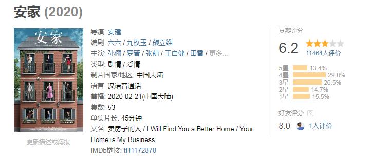 《安家》的豆瓣评分是6.2分,打分都不是很集中,看来评价也是两极分化,一万多人打分,打一星的高达15%,也不少。