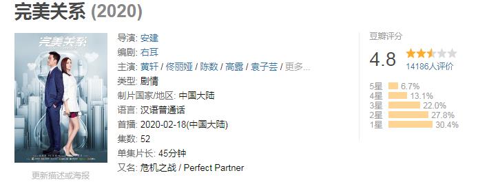 黄轩和佟丽娅主演的www.ku2000.com《完美关系》还是被吐槽,豆瓣评分也不及格,特别打一星的人很多,接近30%,比《安家》都不如。