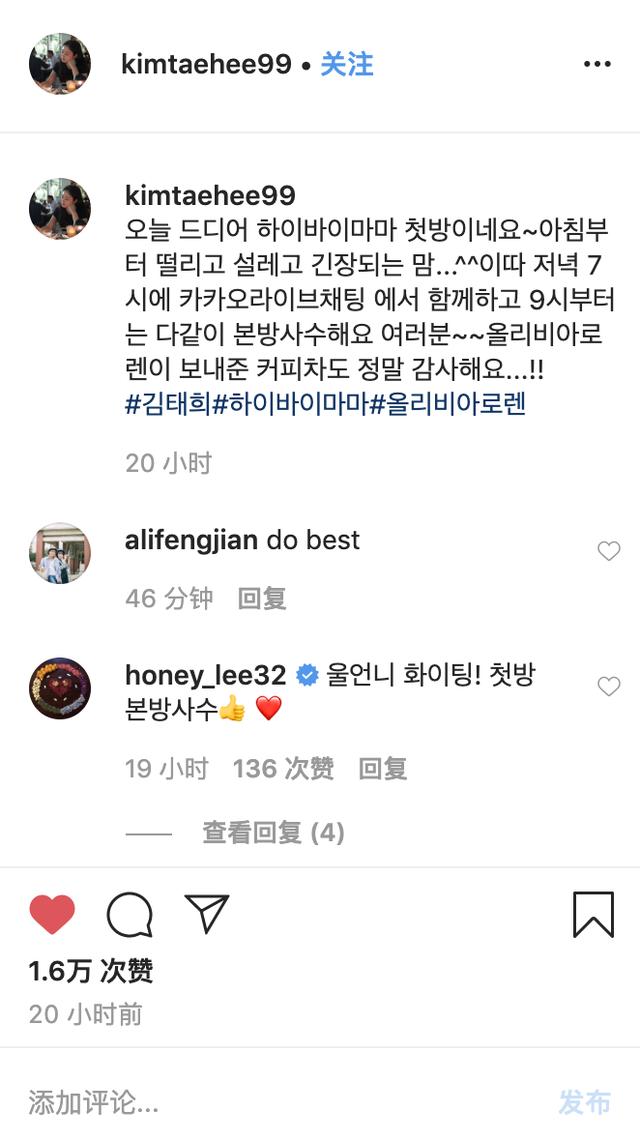 2月23日,金泰熙更新动态,晒出自己的照片为新剧开播造势暖场。她表示自从开播之后非常紧张,不知道是否会冲破《爱的迫降》创下的21.683%的收视新高。照片中金泰熙手里拿着甜品,在一处移动甜品车前拍摄了若干照片。40岁的她依旧颜值在线,皮肤白皙。