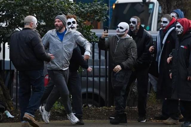 近日在马特·里夫斯《蝙蝠侠》第二摄制组户外片场中,就曝光了一组疑似小丑帮的演员。