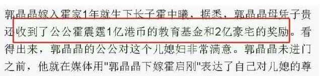 就拿郭晶晶来说吧,给霍家生了三个孩子,没个孩子都获得了1亿元的现金奖励,房产贵重首饰更是拿到手软。