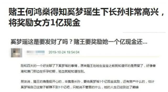 据悉,何鸿燊已经知道了生下长孙的消息,并且还表示,即将要给奚梦瑶1亿元现金的奖励,除此之外还不排除有房产的奖励。