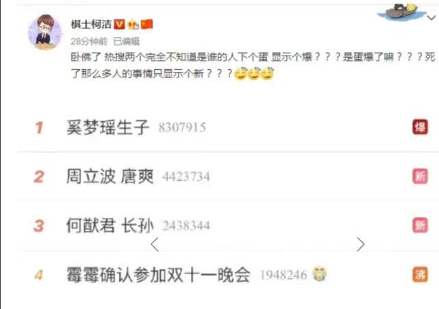 而唯一点评奚梦瑶的还是下围棋的柯洁,只不过他在微博中把奚梦瑶生子比作下了个蛋