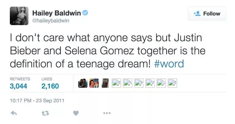 早在10年比伯和Selena被拍到在一起的时候海莉还祝福过他们。