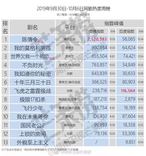 微博、百度指数方面,《陈情令》结局良久,但粉丝的力量仍然庞大,上周其微博指数仍然高居网剧榜首。在播剧中《我的莫格利男孩》微博指数最高。百度指数则由《飞虎之雷霆极战》领衔。