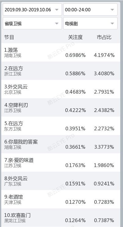 酷云互动给出了较综合的排名,在该评价体系中,五大卫视播出剧集的直播关注度排名依次为《激荡》《在远方》《外交风云》《空降利刃》,与CSM测量仪稍有出入。不过,酷云给出的上周电视剧直播关注度,较前数周绝对值又有下降,最高者也未超0.7。